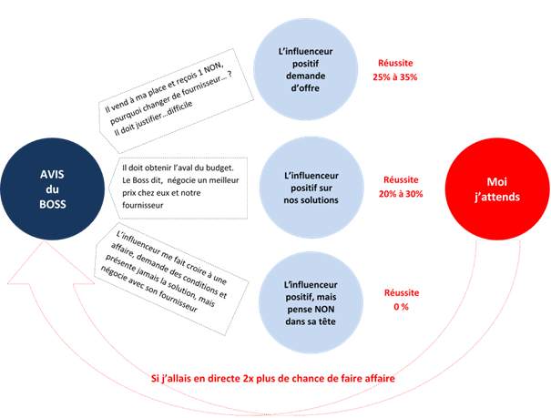 Le deuxième barrage à l’évolution de mon chiffre d’affaire, c’est les RDV avec des influenceurs certes intéressant du point de vue informations et besoins, mais des freins à conclure. Chacun sait qu’une discussion bien orientée avec un vrai décideur donnera rapidement soit un prochain pas ou une réaction négative.