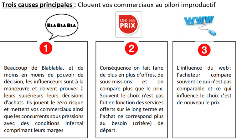Le plus grave dans cette situation c’est le fait, que du côté des acheteurs c’est aussi un énorme gaspillage de temps, faire de 3 à 5 demandes d’offres pour tous les sujets d’achats, comparaison avec le web, discussion de négociation, tableau Excel de comparatif, réunionite a tout va, et finalement ils vont avoir les résultats suivants :