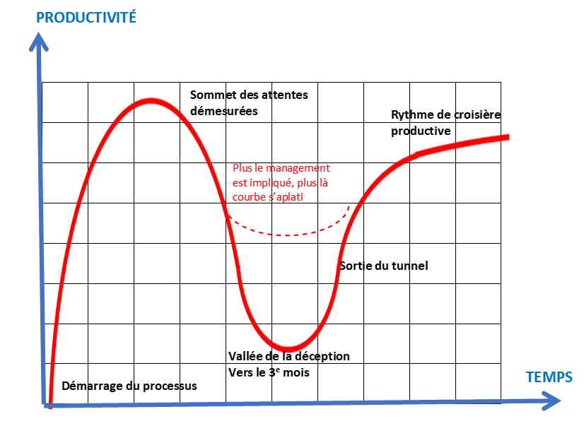 Pour avoir une réelle progression de productivité (d’affaire conclue en plus) il faut tenir compte de la courbe d’apprentissage ou courbe de progression : L’implication du management est indispensable, pour éviter au maximum de descendre dans la vallée de la déception